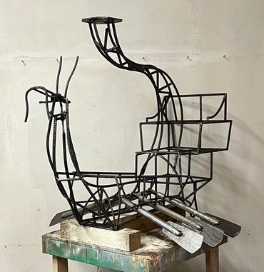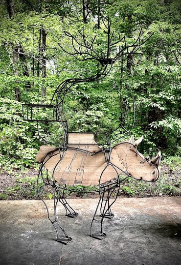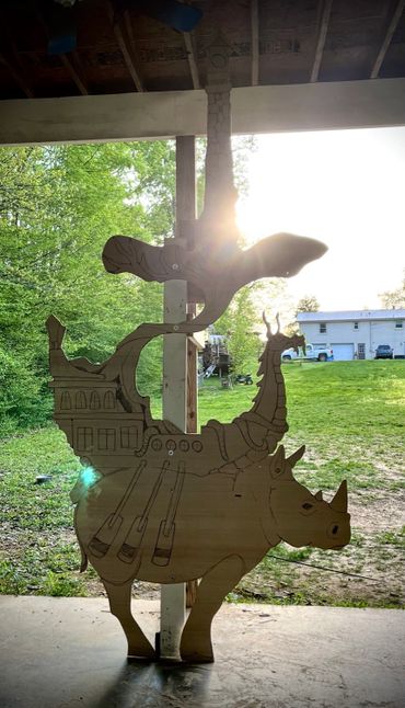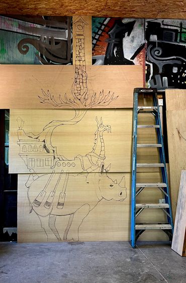 Brian explains the meaning behind each element of the installation thusly. “The rhino is the beast-like innocence of childhood, roaming for meaning. The ship is the adventurous beginnings of an art career, built for purpose and given direction. The tree is middle age’s laying down of roots, letting the world come to it for stability and consistency. The lighthouse represents hope, teaching, and the inclination to give back to those starting out in the world of art.”