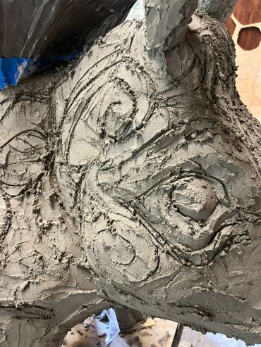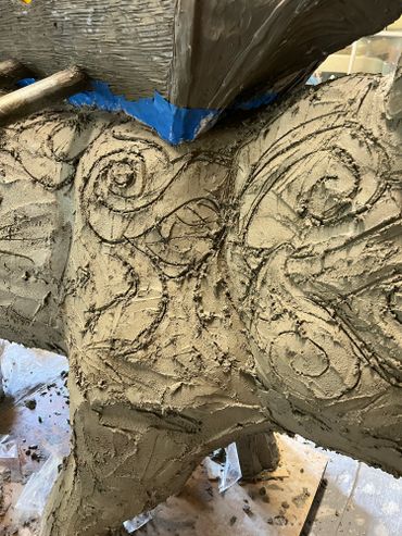 Accompanying the project’s multi-faceted design is an equally eclectic mix of materials, including metal, foam, fiberglass, epoxy, and concrete. Standing at 12-feet tall, “To Tame A Beast” is a monumental public art installation. “The height of this project is really a sweet spot for my work,” Brian explains. “Smaller work doesn’t always have the impact that I’d like. Something too big becomes difficult to move. ‘To Tame A Beast’ is big enough to command the viewer’s attention, but also allows me to cover the installation with its own geography of detail.”